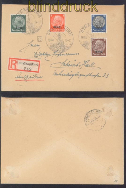 Deutsches Reich Besetzungsausgaben 2.Weltkrieg Elsaß Mi # 4, 5, 6 und 15 MiF auf R-Brief Straßburg SSt. 30.10.1940 portogerechte Mischfrankatur auf Einschreiben mit Sonderstempel SSt. aus Straßburg 30.10.1940 nach Schwäbisch-Hall Ankunftsstempel rückseitig Klebespuren Erhaltung siehe Scan
