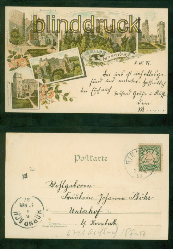 Rheinland-Pfalz Eschbach Litho-AK Gruss von der Madenburg fünf Ansichten 1897 nach Hornbach fünf Ansichten Karte gelaufen aus Rinnthal 6.4.1897 nach Unterhof bei Hornbach Ankunftsstempel Erhaltung siehe Scan