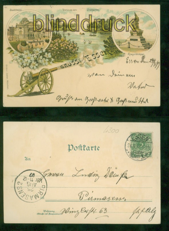 Nordrhein-Westfalen Gruss aus Essen Litho-AK vier Ansichten 1897 nach Pirmasens vier Ansichten: Kanone, Stadttheater, Partie aus dem Stadtgarten und Kriegerdenkmal Karte gelaufen aus Essen 24.8.1897 nach Pirmasens Erhaltung siehe Scan