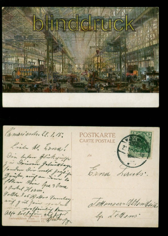 Nordrhein-Westfalen Essen farb-AK Friedrich Krupp A.G. Essen 1915 nach Tettenser-Altendeich Friedrich Krupp A.G. Essen Stahlformerei mit Martinwerk IV Karte gelaufen aus Weddewarden 22.1.1915 nach Tettenser-Altendeich Erhaltung siehe Scan