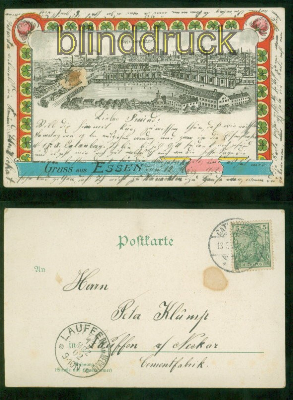 Essen farb-AK Gruss aus ..... Krupps Gußstahlfabrik 1902 nach Lauffen (d9367)