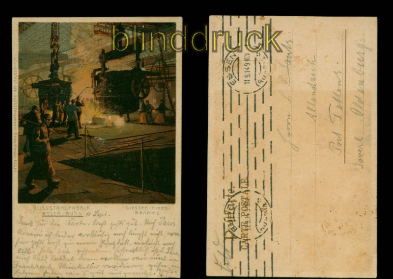 Nordrhein-Westfalen Essen farb-AK Gußstahlfabrik Essen Ruhr Feldpost 1914 nach Tettens Giessen einer Bramme Karte gelaufen mit Feldpost aus Essen 11.9.1914 nach Altendeich Post Tettens 22.1.1915 Erhaltung siehe Scan