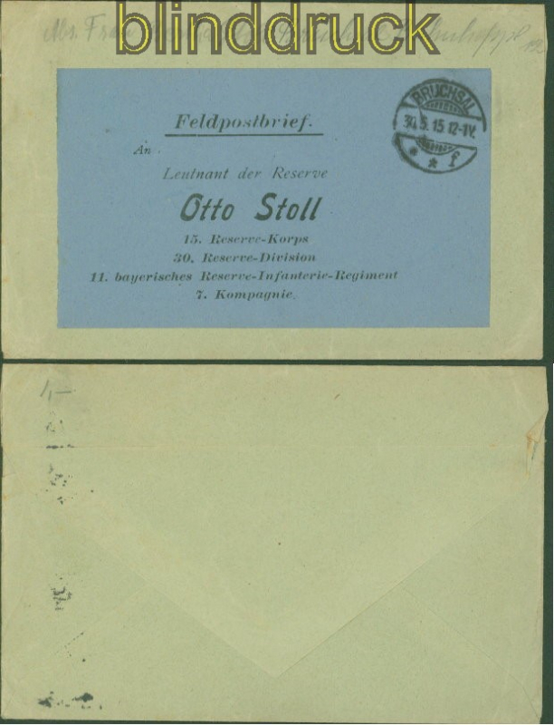 Deutsches Reich Feldpost 1. Weltkrieg Feldpostvordruckbrief Bruchsal 30.5.1915 an eine Feldpostadresse blauer Adressenvordruck auf Feldpostbrief aus Bruchsal 30.5.1915 an einen Leutnant der Reserve Erhaltung siehe Scan