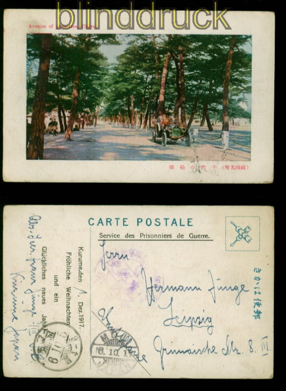 Deutsches Reich Feldpost 1. Weltkrieg KGF aus Japan Lager Kurume 1917 nach Leipzig Kriegsgefangenenpost als Ansichtskarte aus Japan aus dem Lager Kurume Ansichtskartenmotiv: Avenue of pine-tree, Chiyo Weihnachtsgrußkarte Kurume, den 1. Dez. 1917 gelaufen 1.12.1917 nach Leipzig Erhaltung siehe Scan