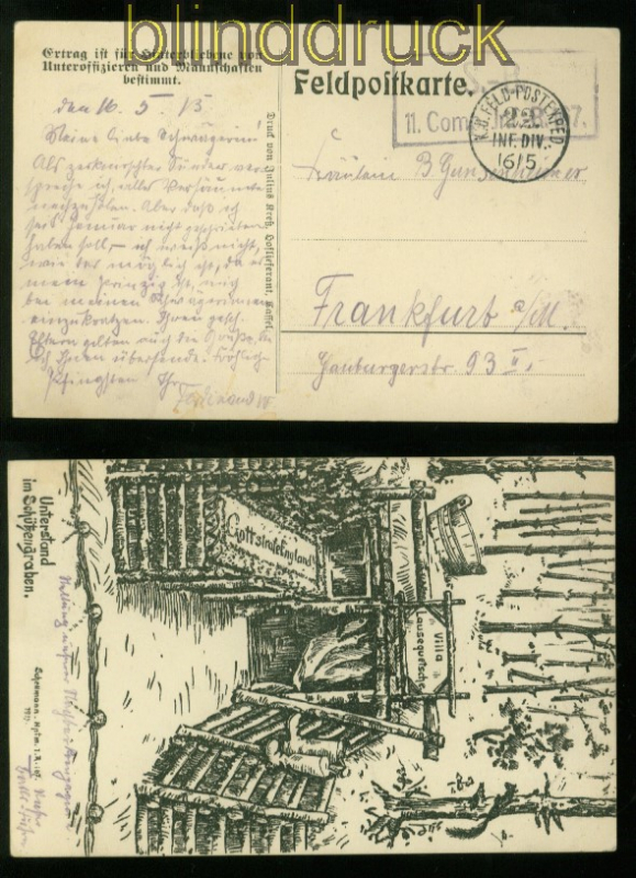 Deutsches Reich Feldpost 1. Weltkrieg sw-AK Unterstand im Schützengraben 1915 von Schellmann, Hptm i. R. 167, illustrierte Feldpostkarte Motiv Villa Lausequetsche Briefstempel R2 in schwarz: S.B. / 11. Comp. Inf. R. 167 Karte gelaufen 16.5.1915 nach Frankfurt Erhaltung siehe Scan