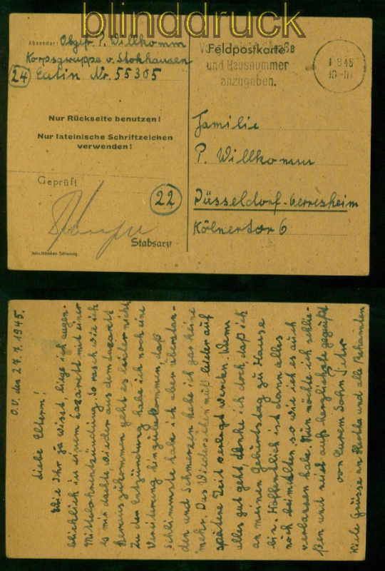 Deutsches Reich Feldpost 2. WK 1.8.1945 Korpsgruppe von Stockhausen Zensur portofreie Feldpostkarte nach Kriegsende der Korpsgruppe von Stockhausen mit Zensur vom Stabsarzt entwertet mit Feldposttarnstempel gelaufen aus Eutin 1.8.1945 nach Düsseldorf gute Erhaltung siehe Scan