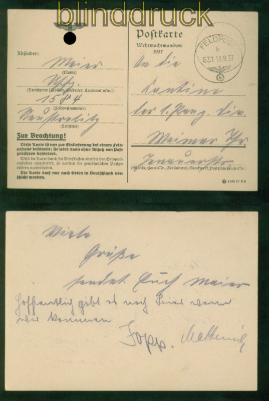 Feldpost Wehrmachtsmanöver 1937 Mi # I A 3 gestempelt 19.9.1937 n Weimar Vordruckkarte für des Wehrmachtsmanöver 1937 mit Feldpost-Normstempel 631 Kennbuchstabe b vom 19.9.1937 gelaufen 19.9.1937 nach Weimar Erhaltung siehe Scan