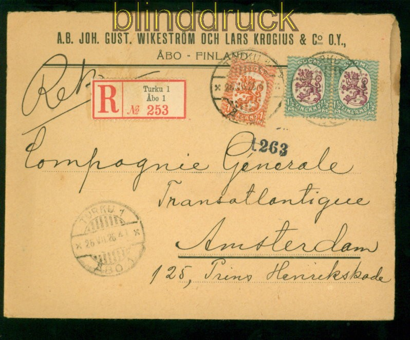 Finnland Mi # 131 und 132 (2) MiF Auslands-R-Brief Turku 26.7.1926 nach Amsterdam schöne Mischfrankatur in Auslandsverwendung als Einschreiben gelaufen aus Turku 26.7.1926 nach Amsterdam Erhaltung siehe Scan