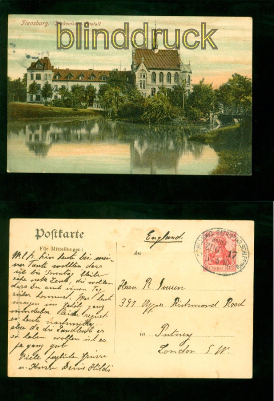 Schleswig-Holstein Flensburg sw-AK Diakonissen-Anstalt Bahnpost 1910 nach London Karte gelaufen mit Bahnpost Schleswig - Satrup (Kr. Schleswig) Zug 17 6.5.1910 nach London Erhaltung siehe Scan