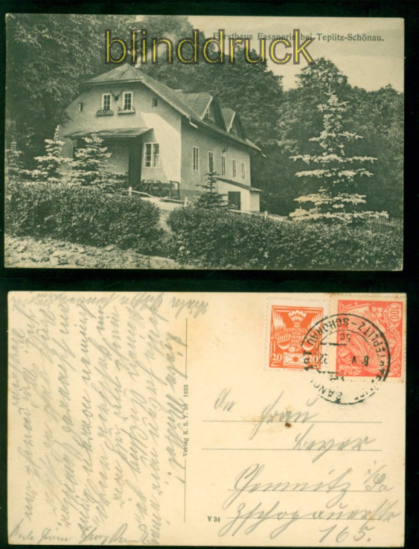 Böhmen Forsthaus Fasenerie bei Teplitz-Schönau sw-AK 1923 nach Chemnitz Karte gelaufen aus Teplitz-Schönau 6.5.1923 nach Chemnitz Erhaltung siehe Scan