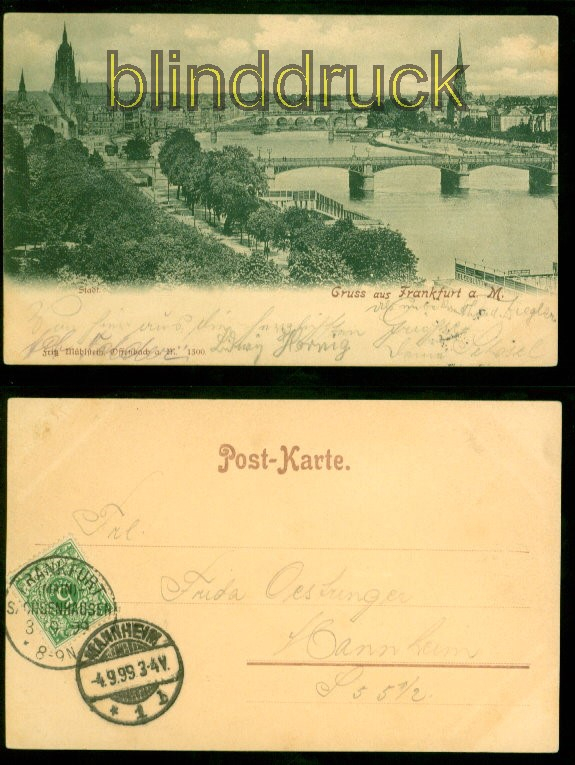 Hessen Frankfurt a.M. sw-AK Mainansicht mit Brücken 1899 nach Mannheim Karte gelaufen aus Frankfurt 3.9.1899 nach Mannheim Ankunftsstempel Erhaltung siehe Scan