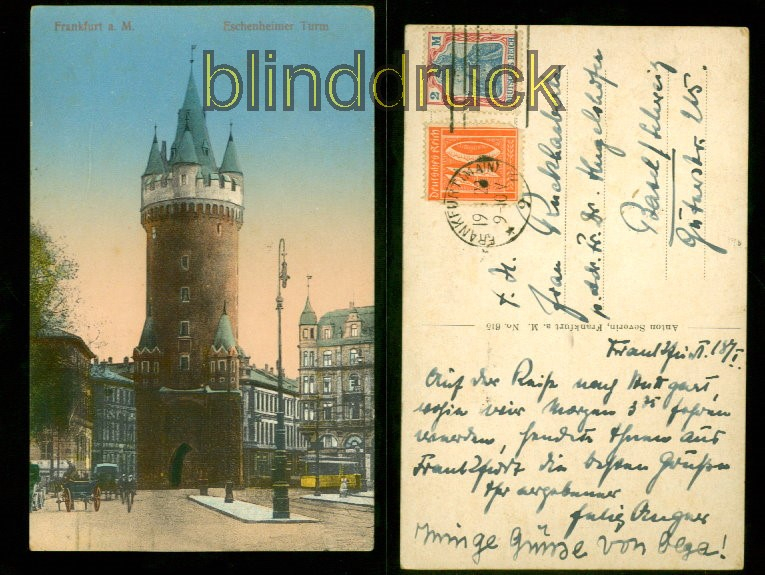 Hessen Frankfurt farb-AK Eschenheimer Turm 1922 nach Basel in der Schweiz Karte gelaufen aus Frankfurt 19.1.1922 nach Basel in der Schweiz Erhaltung siehe Scan