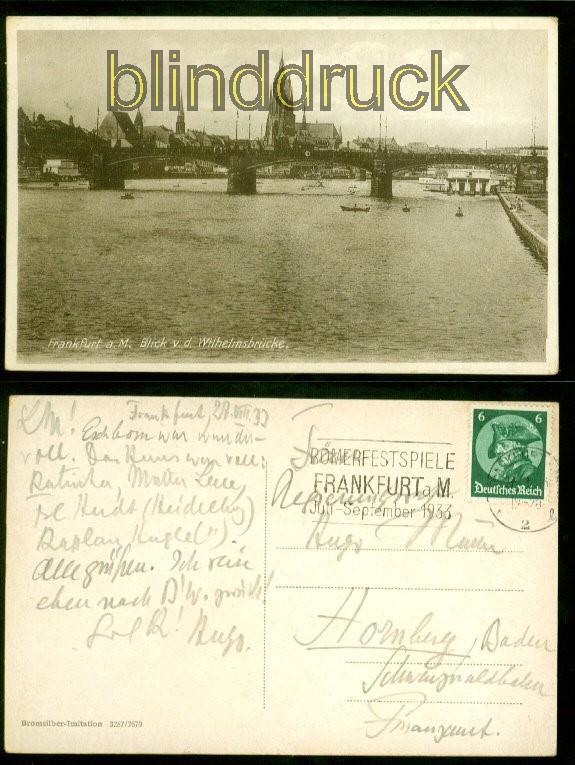 Hessen Frankfurt sw-AK Blick von der Wilhelmsbrücke 1933 nach Homburg Karte gelaufen aus Frankfurt 27.8.1933 nach Homburg Erhaltung siehe Scan
