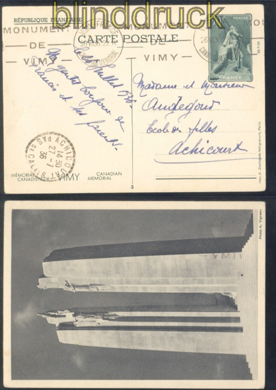 Frankreich GSK P 66 FDC Sonderstempel Ansicht Nr. 5 Kanadierdenkmal Einweihung des Kanadierdenkmal von Vimy entwertet mit Maschinen-Sonderstempel vom Ersttag 26.7.1936 Ansicht # 5 gelaufen nach Achicourt Erhaltung siehe Scan