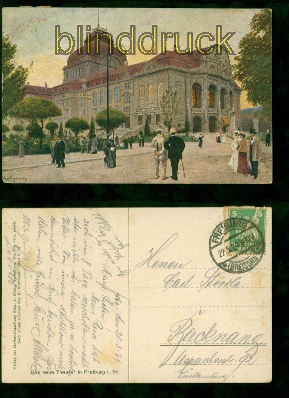 Baden-Württemberg Freiburg i. Br. farb-AK Das neue Theater 1924 nach Backnang KünstlerkarteKünstlerkarte nach einem Original von H. Hoffmann Karte gelaufen aus Freiburg 22.5.1924 nach Backnang Erhaltung siehe Scan