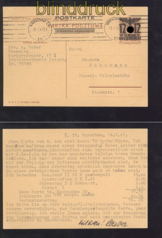 Generalgouvernement GSK P 7 F gestempelt Warschau 15.1.1941 Ganzsachenkarte P 7 F 12 Groschen Aufdruck Frageteil komplett mit Text entwertet Warschau 15.1.1941 adressiert nach Kassel - Wilhelmshöhe Erhaltung siehe Scan