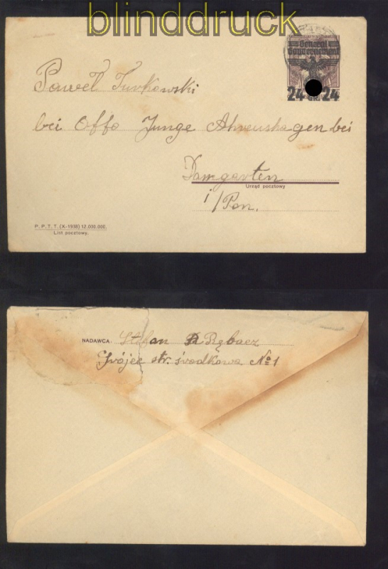 Generalgouvernement GSU U 1 nach Damgarten Ganzsachenumschlag Aufdruck 24 Groschen mit diversen Spuren in der Mitte senkrecht gefaltet gelaufen nach Damgarten Erhaltung siehe Scan