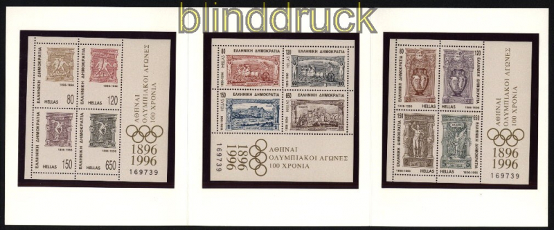 Griechenland Mi # Blöcke 13/15 postfrisch 100 Jahre Olympische Spiele im Folder drei Blockausgaben 100 Jahre Olympische Spiele der Neuzeit komplette Ausgabe postfrisch im Folder Erhaltung siehe Scan