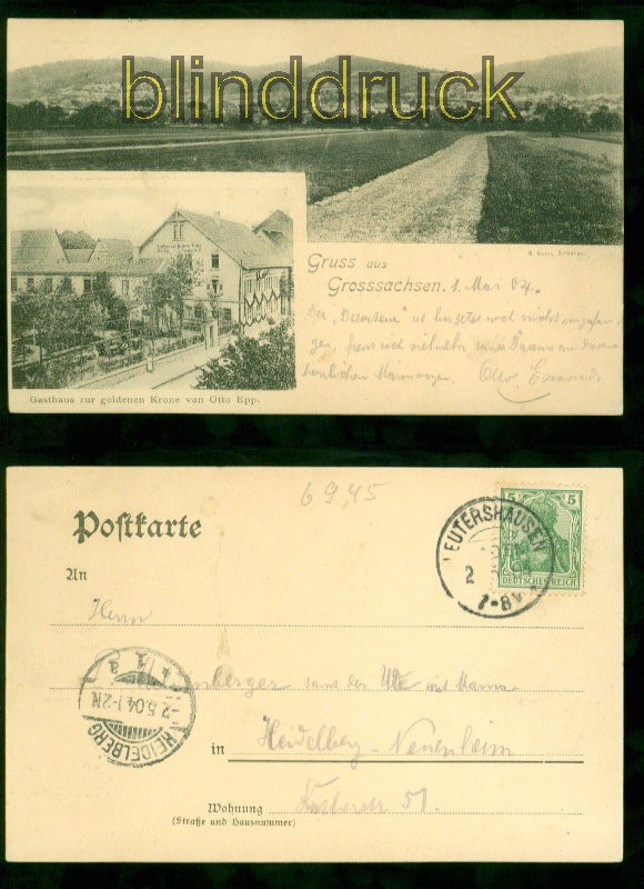Baden-Württemberg Gruss aus Grosssachsen sw-AK zwei Ansichten Gesamtansicht und Gasthaus 1904 zwei Ansichten: Gesamtansicht und Gasthaus zur goldenen Krone von Otto Epp Karte gelaufen aus Leutershausen 2.5.1904 nach Heidelberg Ankunftsstempel Erhaltung siehe Scan