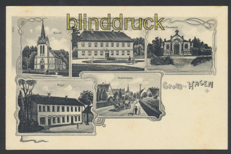 Nordrhein-Westfalen Gruss aus Hagen i. Br. sw-AK fünf Ansichten ungebraucht fünf Ansichten: Kirche, Oberförsterei mit Stahleiche, Hünkens Mausoleum, Post und Hauptstrasse neue Kath. Kirche und Totalansicht Karte nicht gelaufen Erhaltung siehe Scan