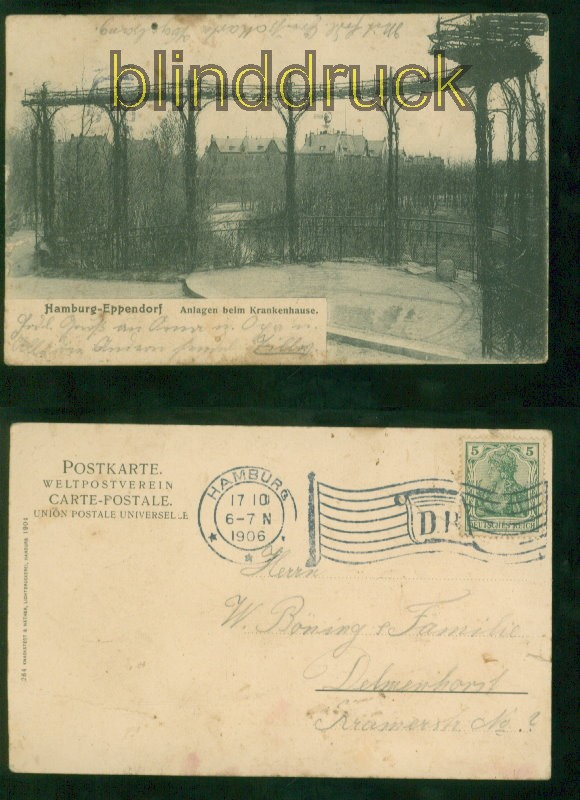 Hamburg Eppendorf sw-AK Anlagen beim Krankenhaus 1906 nach Delmenhorst Marke entwertet mit der Columbia-Stempelmaschine 52/14 Karte gelaufen aus Hamburg 17.10.1906 nach Delmenhorst Karte etwas felckig Erhaltung siehe Scan