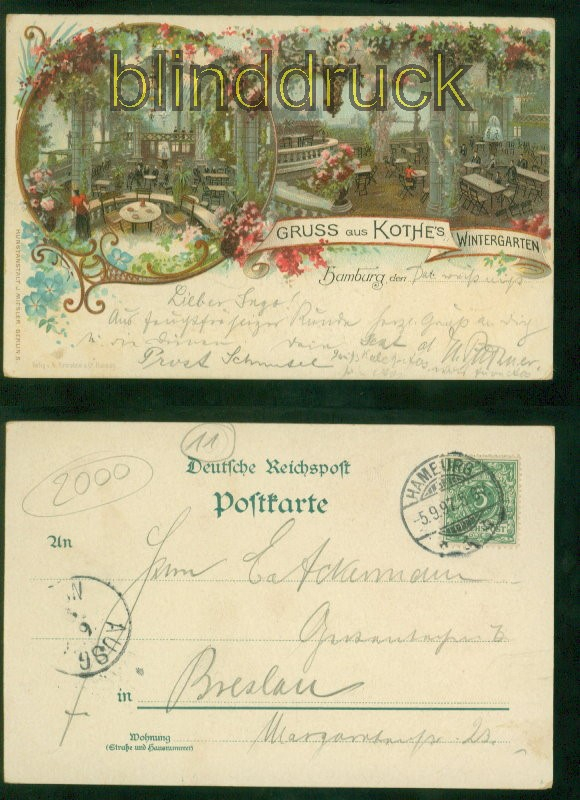 Hamburg Litho-AK Gruss aus Kothe´s Wintergarten 1897 nach Breslau Karte gelaufen aus Hamburg 5.9.1897 nach Breslau Ankunftsstempel Erhaltung siehe Scan