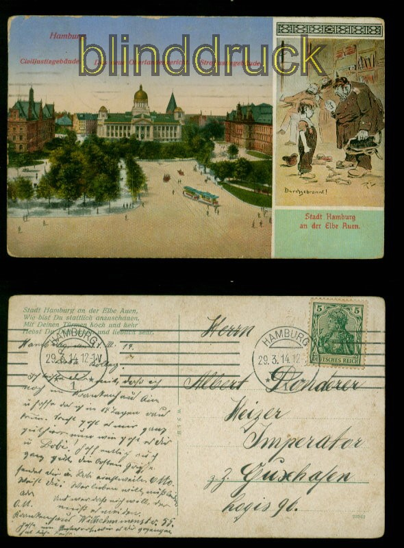 Hamburg farb-AK drei Justizgebäude mit Karikatur 1914 an S.S. Imperator Civiljustizgebäude, das neue Oberlandesgericht und Strafjustizgebäude rechts mit Karikatur "Durchgebrannt" Stadt Hamburg an der Elbe Auen Karte gelaufen aaus Hamburg 29.3.1912 an einen Heizer auf der S.S. Imperator in Cushaven Erhaltung siehe Scan