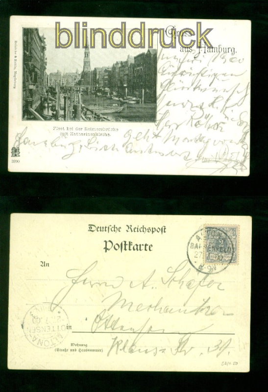 Hamburg sw-AK Fleet bei der Reimersbrücke mit Katharinenkirche Ortspostkarte 1900 Karte gelaufen als Ortspostkarte auf Altona-Bahrenfeld 27.7.1900 nach Ottensen Ankunftsstempel Erhaltung siehe Scan