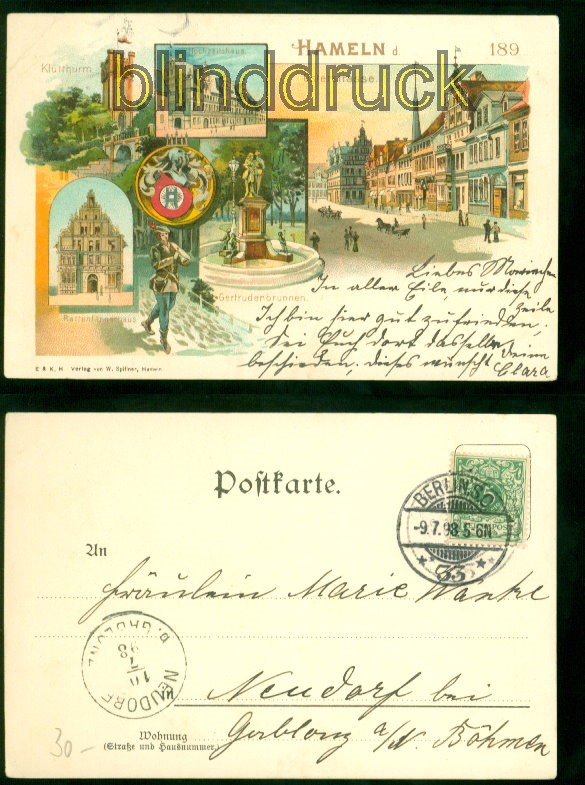 Niedersachsen Gruss aus Hameln Litho-AK .... sechs Ansichten 1898 aus Berlin nach Neudorf sechs Ansichten: Klütthurm, Hochzeitshaus, Osterstrasse, Rattenfängerhaus, Rattenfänger und Gertrudenbrunnen Karte gelaufen aus Berlin 9.7.1898 nach Neudorf bei Gablonz Ankunftsstempel Erhaltung siehe Scan