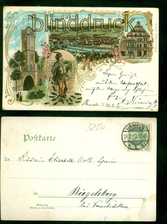 Niedersachsen Gruss aus Hameln Litho-AK vier Ansichten 1912 nach Biegelsberg Karte gelaufen aus Hameln 24.2.1912 nach Biegelsberg Erhaltung siehe Scan