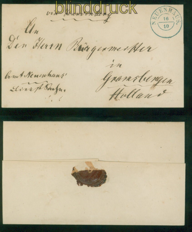 Hannover Dienstbriefhülle aus Neuenhaus nach Grambergen in Holland gelaufen aus Neuenhaus 16.10. nach Grambergen in Holland Feuser # 221 ohne Inhalt gerichtet an den Bürgermeister in Grambergen mit Leitvermerk via Hardenberg Erhaltung siehe Scan