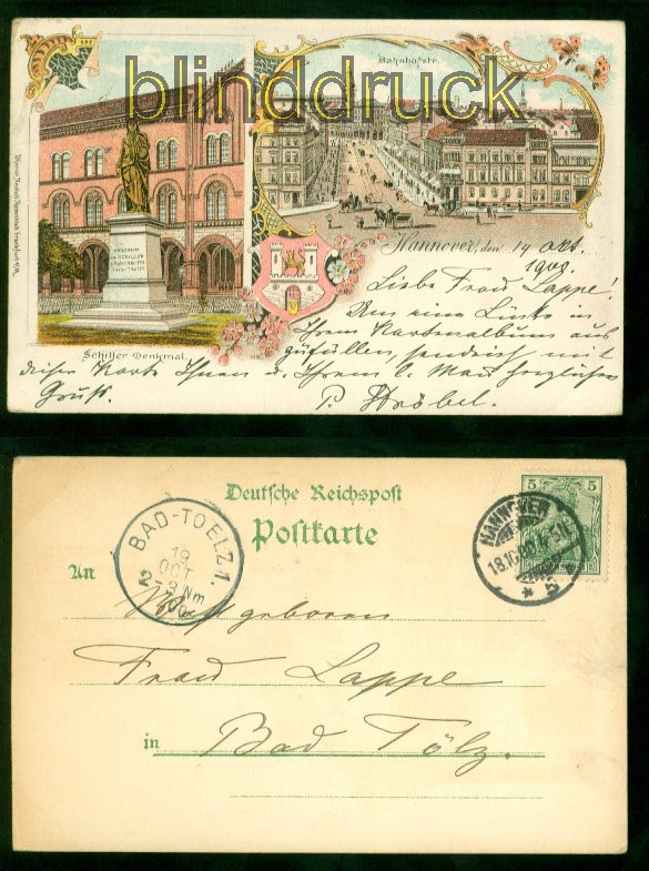 Niedersachsen Gruss aus Hannover Litho-AK zwei Ansichten 1900 nach Bad Tölz zwei Ansichten: Bahnhofstrasse und Schiller-Denkmal Karte gelaufen aus Hannover 18.10.1900 nach Strassburg Ankunftsstempel Erhaltung siehe Scan