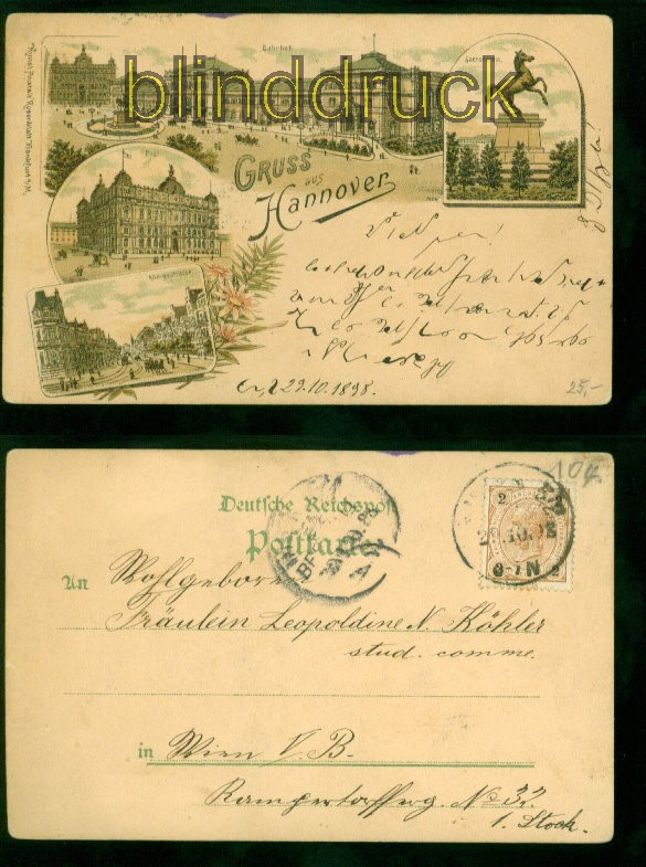 Niedersachsen Hannover Litho-AK vier Ansichten 1908 Ortspostkarte Wien vier Ansichten: Bahnhof, Sachsenross, Post und Königstrasse Karte gelaufen als Ortspostkarte Wien 29.10.1908 Erhaltung siehe Scan
