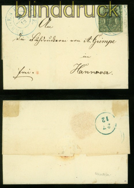 Hannover Mi # 2 aus Bergen bei Celle in blau nach Hannover 1 Ggr. mit Wasserzeichen 2 auf Brief mit blauem Stempel aus Bergen bei Celle 26.12. nach Hannover guter Schnitt, nicht berührt Erhaltung siehe Scan