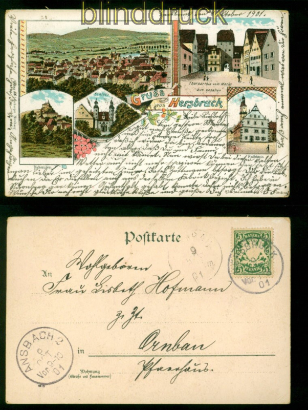 Bayern Gruss aus Hersbruck sw-AK 5 Ansichten 1901 nach Ornbau fünf Ansichten: Totalansicht, Thorpartie vom Markt aus gesehen, Rathaus, Hohenstein und Schloss Karte gelaufen aus Hersbruck 9.10.1901 nach Ornbau Erhaltung siehe Scan