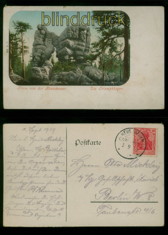 Schlesien Gruß von der Heuscheuer farb-AK Die Triuphbogen 2.9.1919 nach Berlin Karte gelaufen aus Heuscheuer-Carlsberg 2.9.1919 nach Berlin Erhaltung siehe Scan