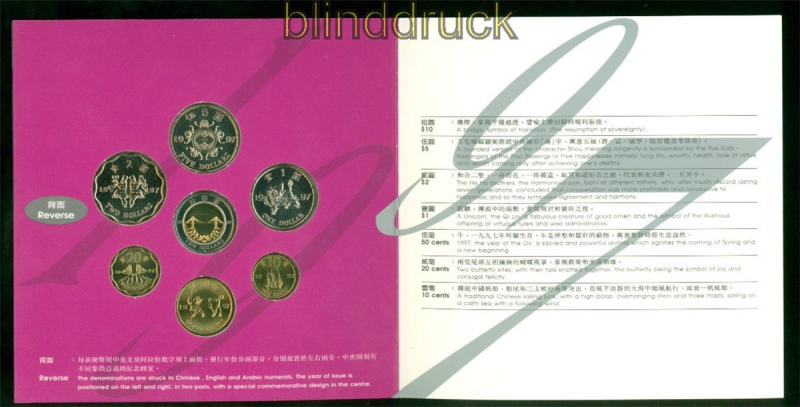 Hongkong KMS 1997 im Folder Stempelglanz SELTEN !!!!!! Kursmünzensatz Jahrgang 1997 Stempelglanz im Folder einwandfreie Erhaltung siehe Scan