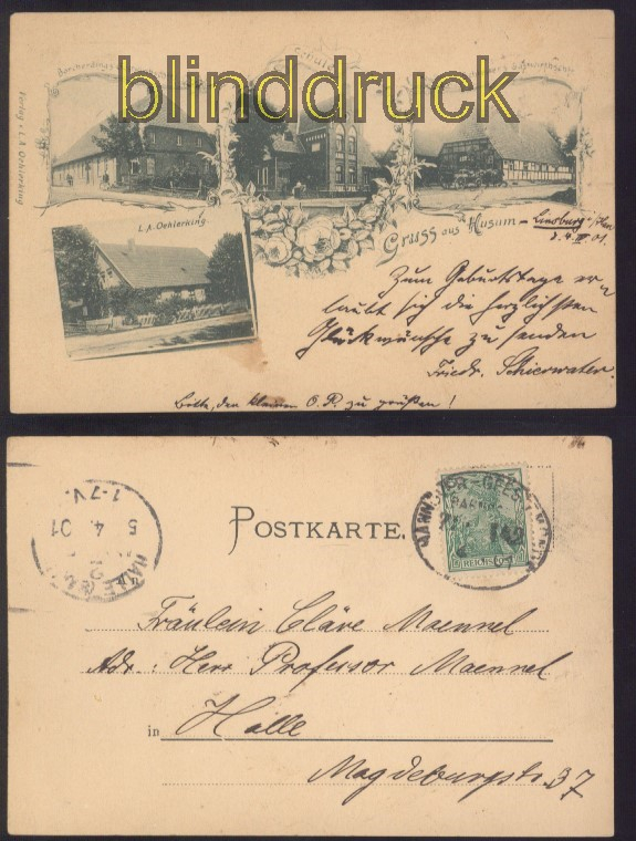 Niedersachsen Gruss aus Husum sw-AK vier Ansichten Bahnpost 1901 vier Ansichten: Borcherdings Gastwirtschaft, Schule, Schleirers Gastwirtschaft und L.A. Oehlerking Karte gelaufen mit Bahnpost Hannover - Geestemünde Zug 142 4.4.1901 nach Halle Erhaltung siehe Scan