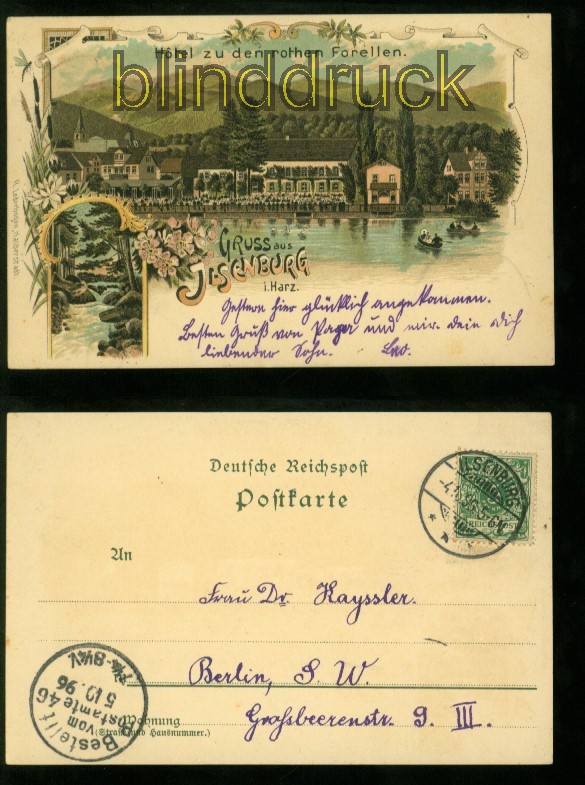 Sachsen-Anhalt Gruss aus Ilsenburg im Harz farb-Litho--AK zwei Ansichten 1896 zwei Ansichten Hotel zu den rothen Forellen Karte gelaufen aus Ilsenburg 4.10.1896 nach Berlin Erhaltung siehe Scan