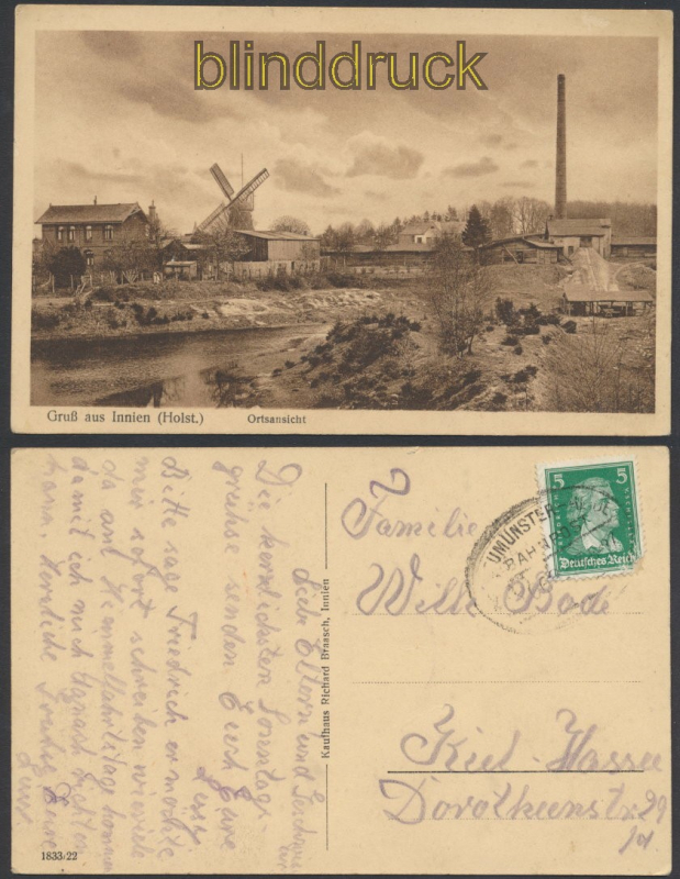 Schleswig-Holstein Gruss aus Innien (Holstein) sw-AK Ortsansicht mit Windmühle und Fabrik 1927 Karte gelaufen mit Bahnpost Neumüster - Heide 1927 nach Kiel Erhaltung siehe Scan