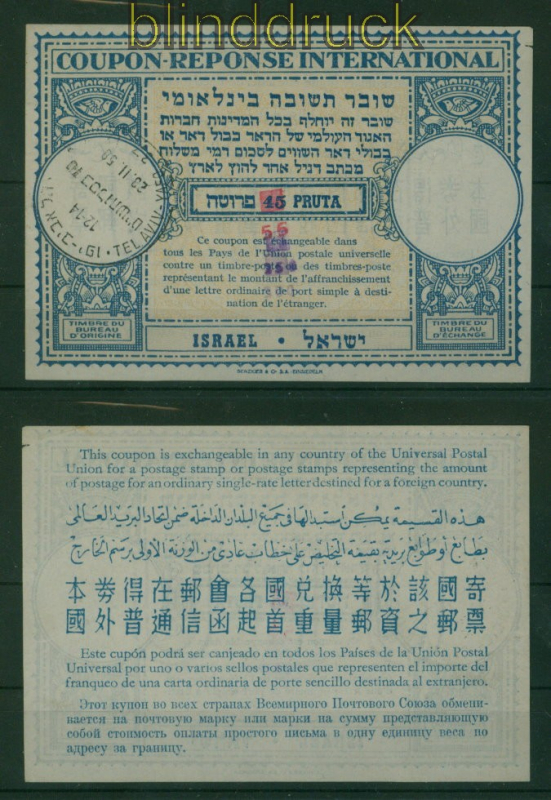 Israel Internationaler Antwortschein IAS # 4 IRC CRI 250 a 55 a 45 Pruta (60188)
