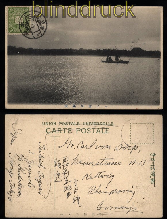 Japan Mi # 77 EF auf sw-AK 1928 nach Kettwig 2 Sen hellgrün br> vorderseitig frankiert auf sw-Anischtskarte Karte gelaufen 1928 nach Kettwig Erhaltung siehe Scan