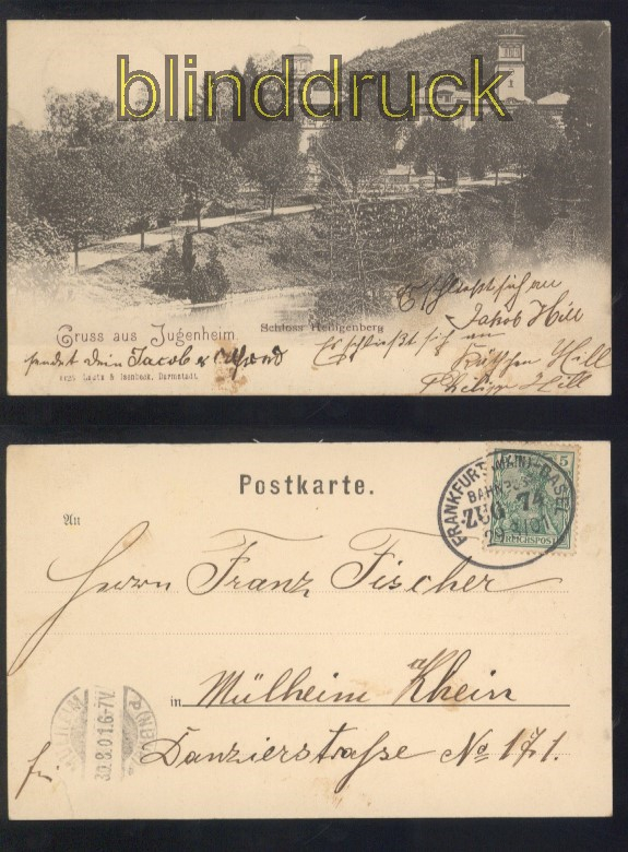 Hessen Gruss aus Jugenheim sw-AK Schloss Heligenberg Bahnpost 1901 Karte gelaufen mit Bahnpost Frankfurt (Main) - Basel Zug 74 29.8.1901 nach Mühlheim am Rhein Erhaltung siehe Scan
