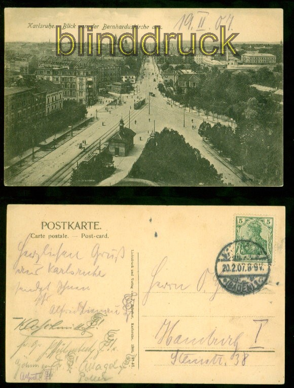 Baden-Württemberg Karlsruhe sw-AK Blick von der Bernharduskirche 1907 nach Hamburg Karte gelaufen aus Karlsruhe 20.2.1907 nach Hamburg Erhaltung siehe Scan