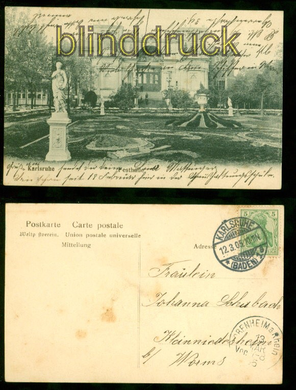 Baden-Württemberg Karlsruhe sw-AK Festhalle 1905 nach Kleinniedesheim Karte gelaufen aus Karlsruhe 12.3.1905 nach Kleinniedesheim Ankunftsstempel Erhaltung siehe Scan