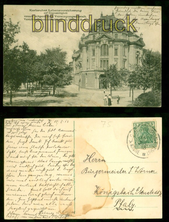 Baden-Württemberg Karlsruhe sw-AK Lebensversicherung auf Gegenseitigkeit 1913 Bahnpost vormals Allgemeine Versicherungsanstalt Versicherungsbestand Ende 1912: 785 Millionen Mark Karte gelaufen mit Bahnpost Karlsruhe - Ludwigshafen 15.7.1913 nach Königsbach Erhaltung siehe Scan