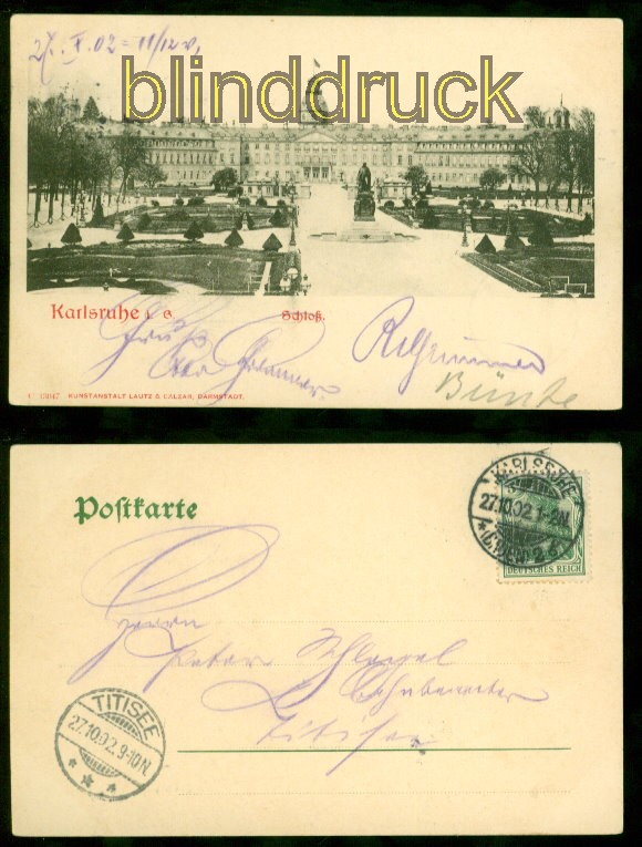 Baden-Württemberg Karlsruhe sw-AK Schloss 1902 nach Titisee Karte gelaufen aus Karlsruhe 27.10.1902 nach Titisee Erhaltung siehe Scan