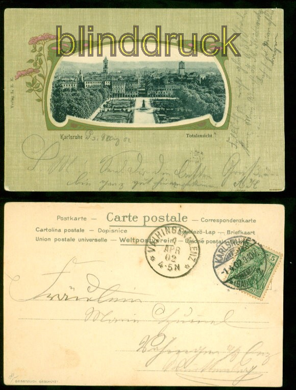 Baden-Württemberg Karlsruhe sw-AK Totalansicht 1902 nach Vaihingen Karte gelaufen aus Karlsruhe 1.4.1902 nach Vaihingen Ankunftsstempel Erhaltung siehe Scan