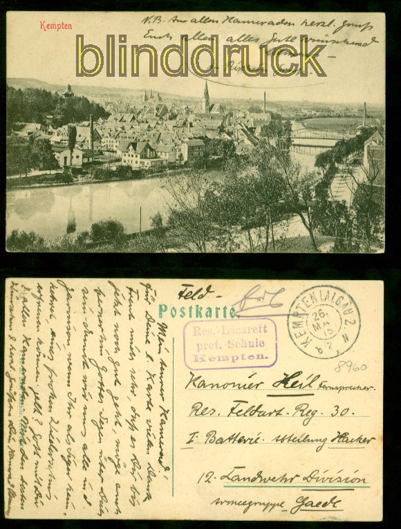 Baden-Württemberg Kempten sw-AK Totalansicht Feldpost 1915 Res. Lazarett Karte gelaufen als Feldpostkarte aus Kempten 26.5.1915 an eine Feldpostadresse Briefstempel Res.-Lazarett prot. Schule Kempten Erhaltung siehe Scan