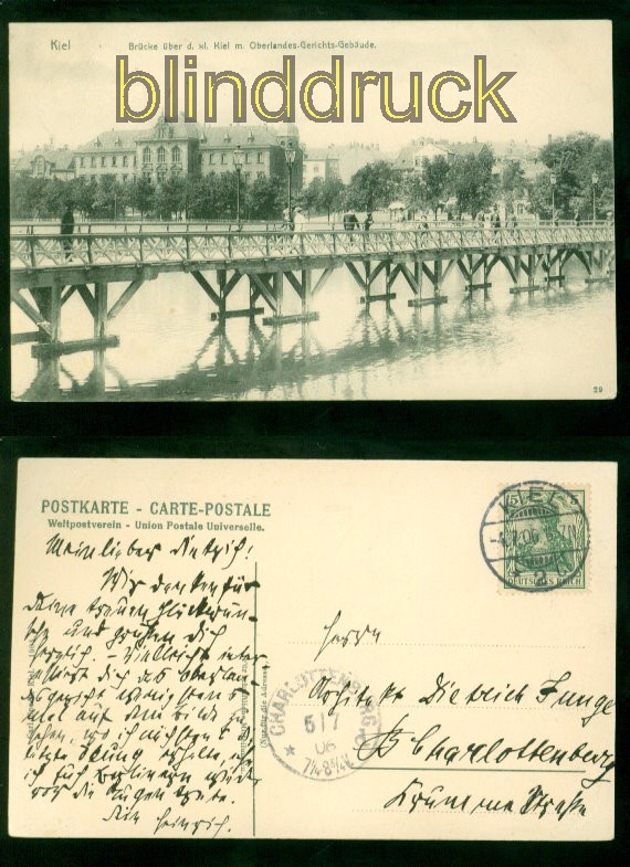 Schleswig-Holstein Kiel sw- AK Brücke über den kleinen Kiel mit Oberlandes-Gerichts-Gebäude 1906 nach Charlottenburg Karte gelaufen aus Kiel 4.7.1906 nach Charlottenburg Ankunftsstempel Erhaltung siehe Scan